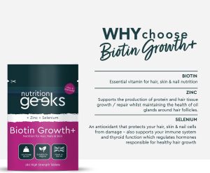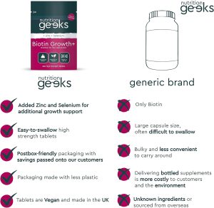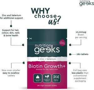 That’s why we chose Nutrition Geeks Biotin 10,000 mcg – a high-strength, vegan-friendly supplement enhanced with Zinc and Selenium for maximum benefits.